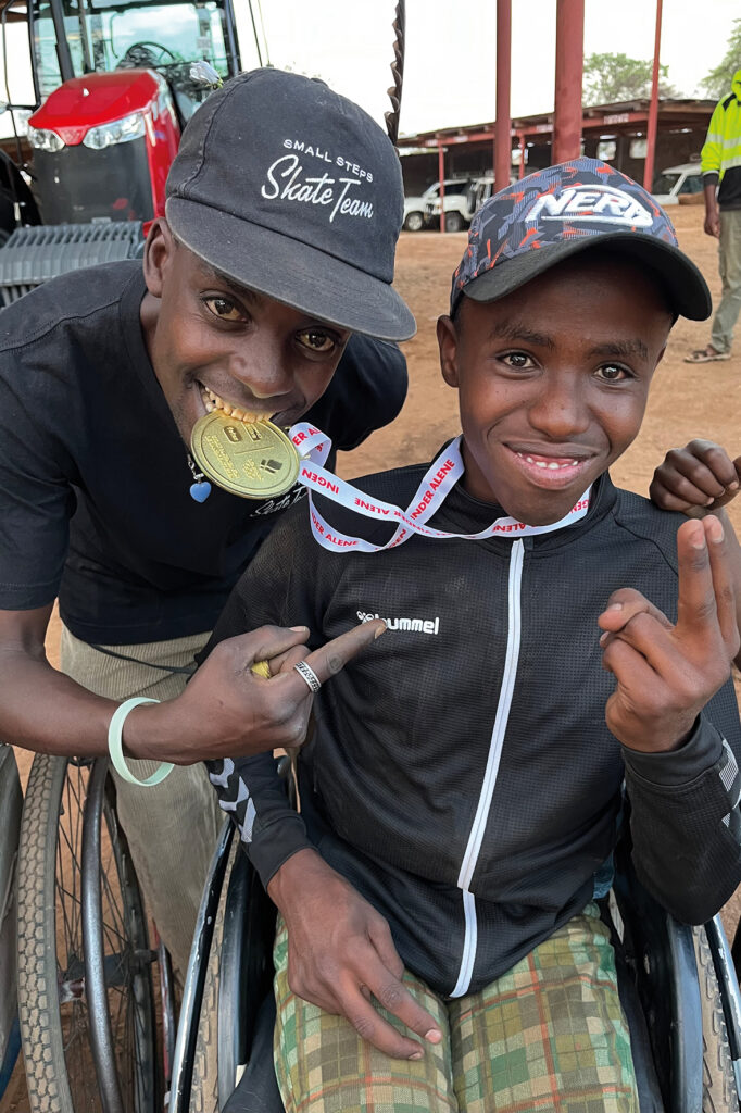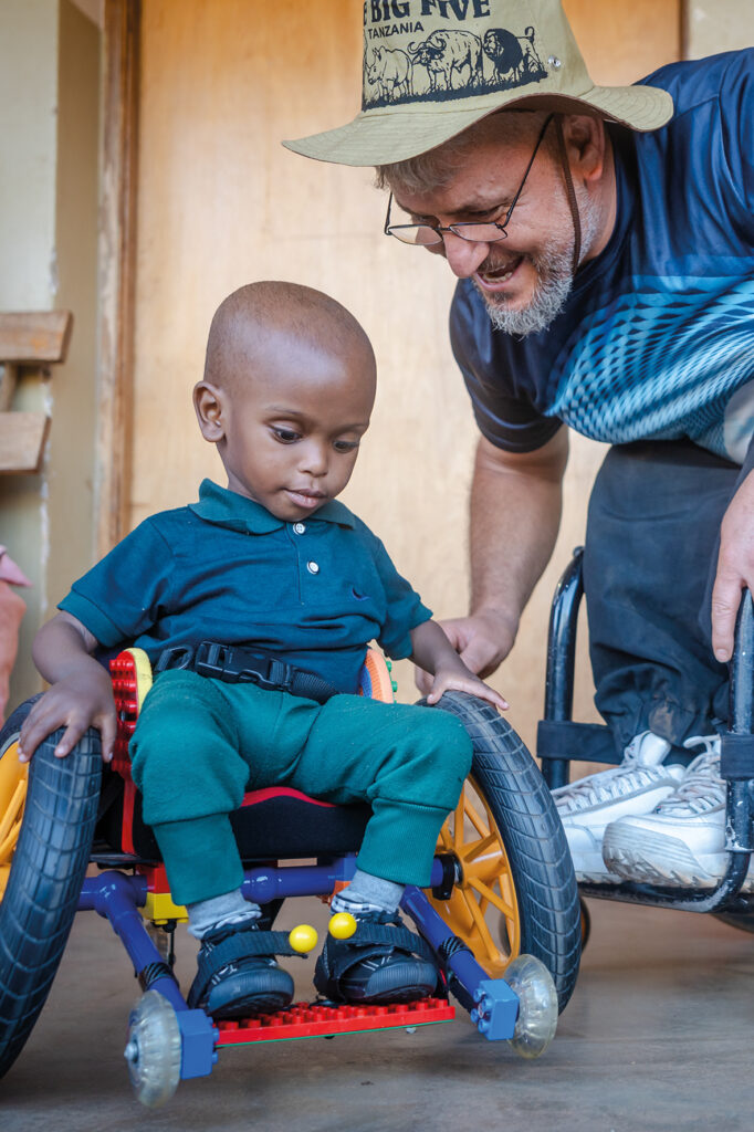 Bald fiel uns ein dreijähriger Junge auf, der, wie die meisten in seinem Alter, noch keinen Rollstuhl hatte. Er blickte vom Schoß seiner Mutter auf unseren Duplikart. Na klar, durfte er den ausprobieren. Die Freude und das Staunen einer Traube von Zuschauenden waren förmlich greifbar, als der Junge seine ersten eigenen Meter im Rollstuhl zurücklegte. Schnell wurde uns klar, wir hatten den Jungen gefunden, dem wir diesen kleinen Rollstuhl mitgeben werden. Mit der Mutter vereinbarten wir, dass sie den Duplikart nach einem Jahr, wenn er voraussichtlich nicht mehr passen wird, wieder nach Haydom zurückbringt. Für die Fortbewegung draußen bestellten wir für ihn einen geländegängigen Rollstuhl. Es war faszinierend zu beobachten, wie schnell er lernte mit dem kleinen Rolli die Umgebung selbstständig zu erobern.