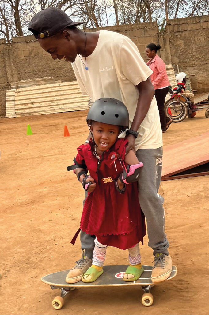 Ein Highlight für Eltern und Kinder waren die beiden Sportnachmittage. Während es sonst etwas schwierig war, einen geeigneten Platz für das Sportangebot zu finden, kann in diesen Spina-Bifida-Wochen jeweils an zwei Nachmittagen ein Parkplatzgelände der Klinik genutzt werden. Die eigens von Haydom-friends dafür hergestellten Metallrampen wurden mit vereinten Kräften hervorgeholt und aufgebaut und die Kids eroberten die Rampen und das Gelände, dass es eine Freude war. Ob mit Gillard oder allein auf dem Skateboard oder wie Shamal, Johari und Elias mit Rollstuhl, selbst fahrend oder geschoben werdend, die Bewegungsfreude war enorm. Beeindruckend waren auch die Mamas, die beim Seilspringen ihre Künste zeigten.