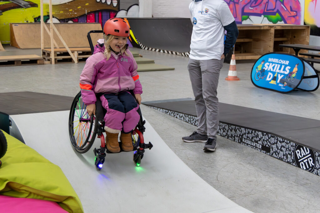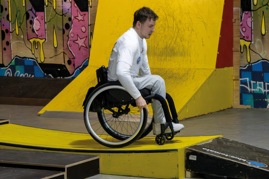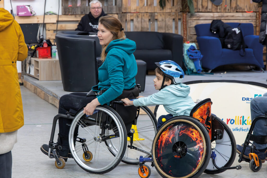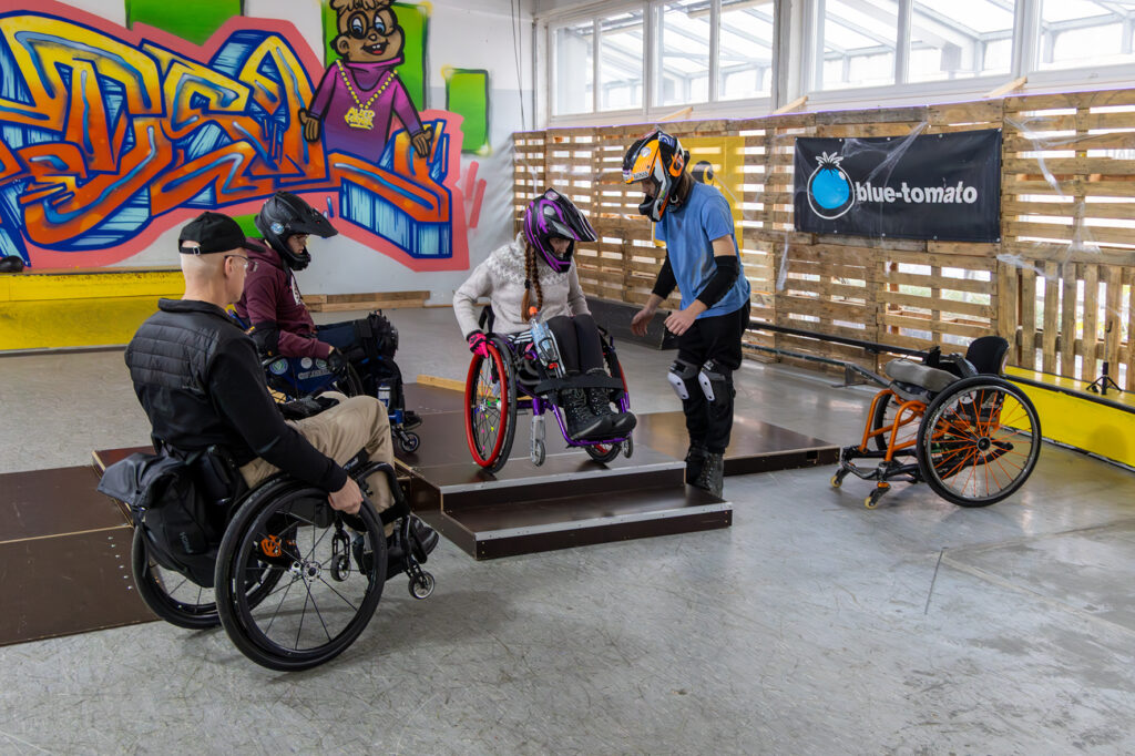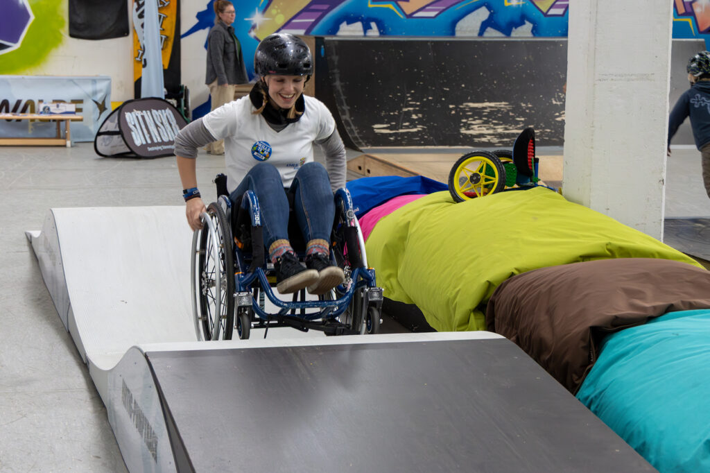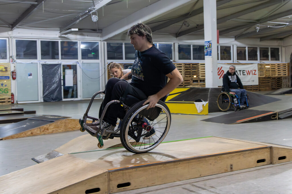 Harmonisch in die vorhandene ›Hindernislandschaft‹ des Indoor-Skateparks eingebettet, forderten und förderten die Hindernisse die individuellen Rollstuhl-Skills der Teilnehmenden. Rund 60 Menschen jeden Alters konnten ihre sportlichen Fähigkeiten im und mit dem Rollstuhl zeigen und Neues lernen. Auch Eltern und Geschwisterkinder wagten sich in den Parcours und nutzten die zur Verfügung gestellten Rollstühle, um sich und ihre Fähigkeiten zu testen.
