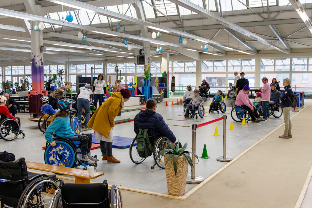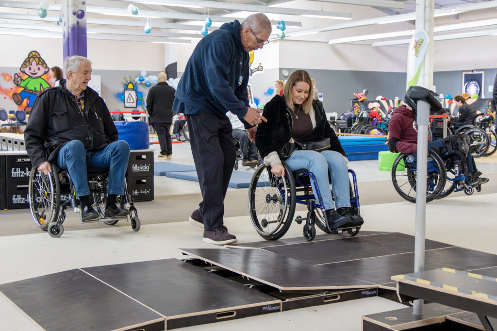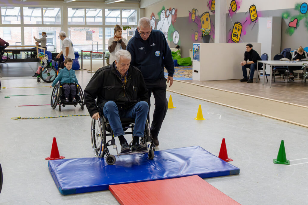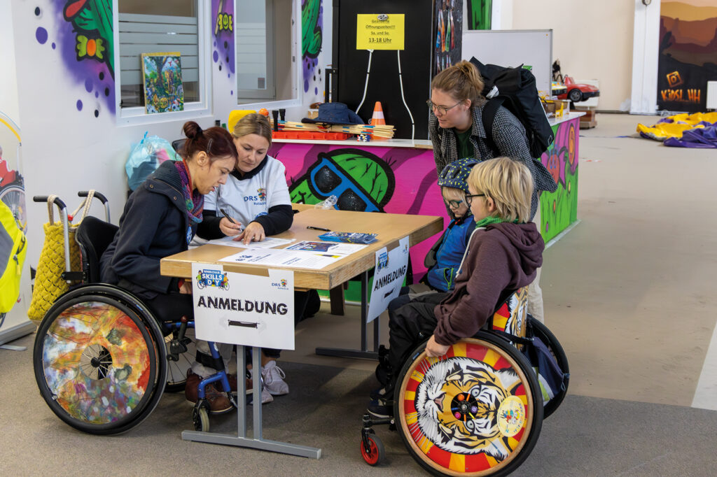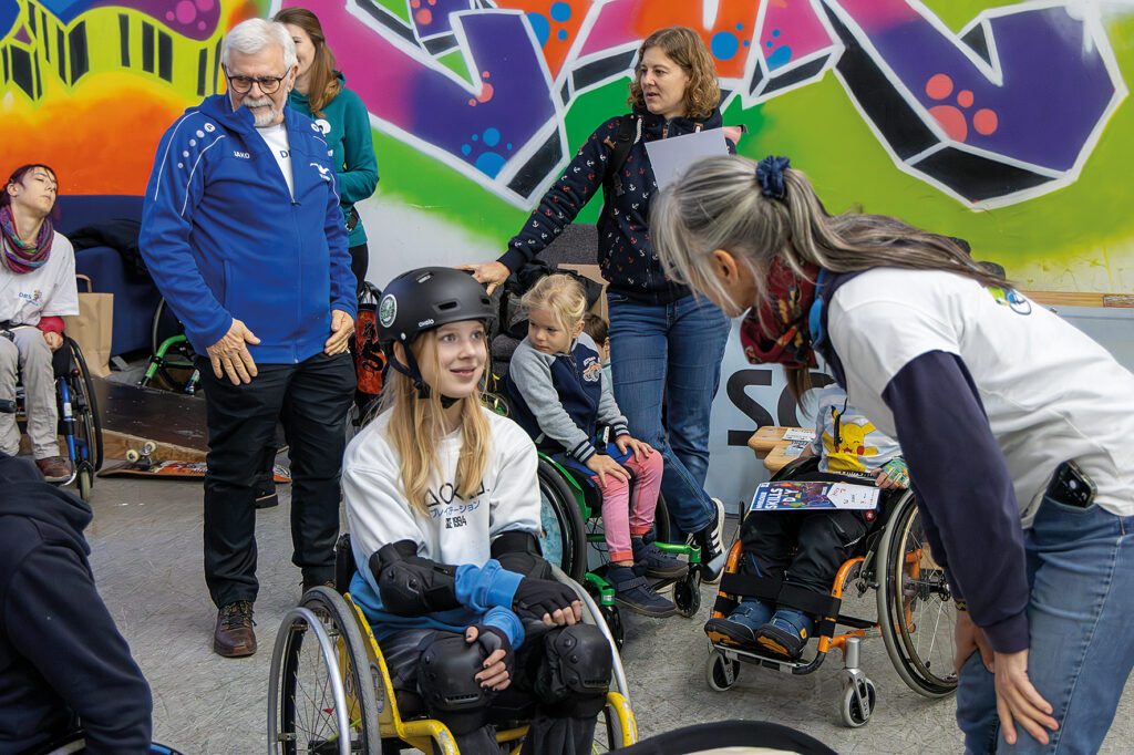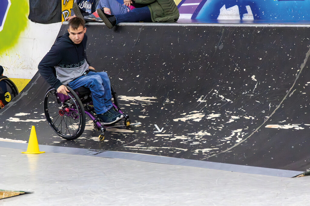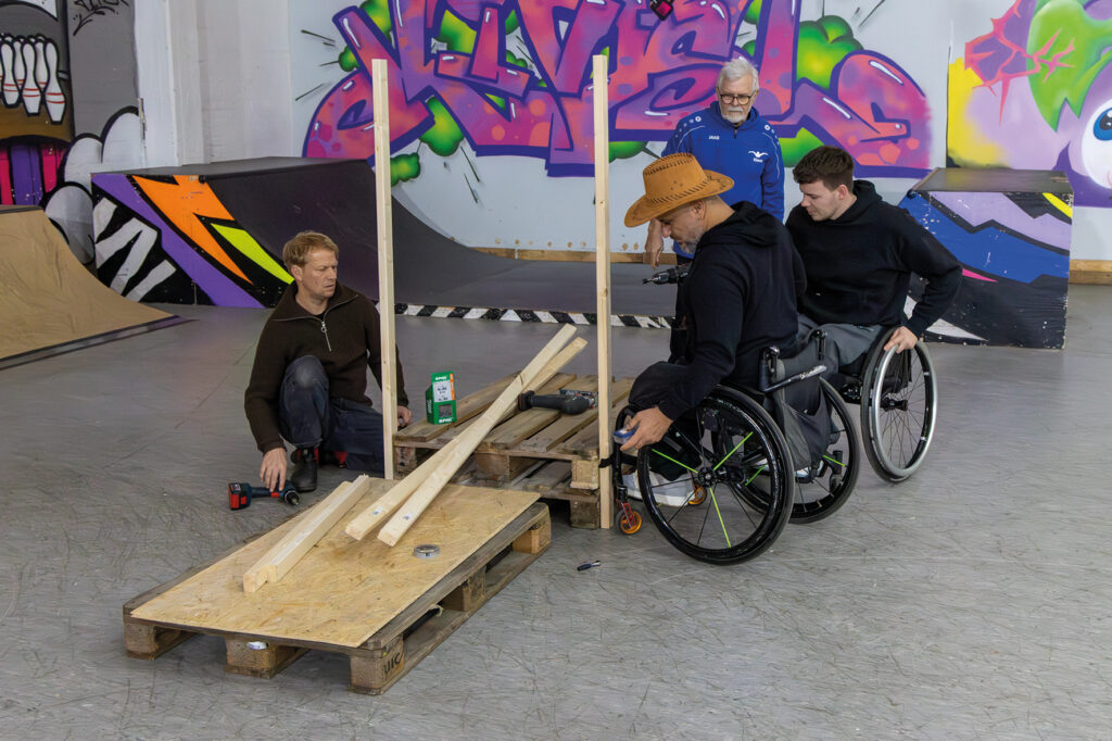 Harmonisch in die vorhandene ›Hindernislandschaft‹ des Indoor-Skateparks eingebettet, forderten und förderten die Hindernisse die individuellen Rollstuhl-Skills der Teilnehmenden. Rund 60 Menschen jeden Alters konnten ihre sportlichen Fähigkeiten im und mit dem Rollstuhl zeigen und Neues lernen. Auch Eltern und Geschwisterkinder wagten sich in den Parcours und nutzten die zur Verfügung gestellten Rollstühle, um sich und ihre Fähigkeiten zu testen.