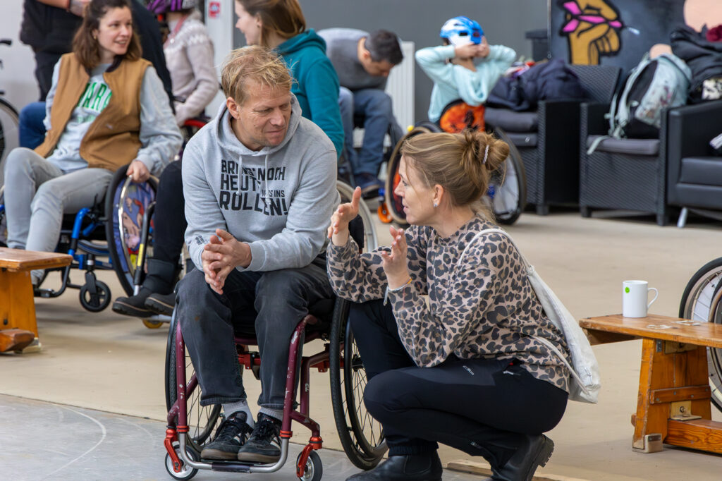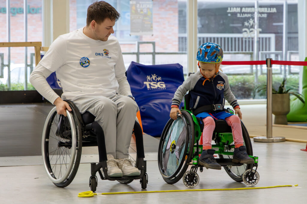 Und so konnten es die einen kaum erwarten, die unterschiedlich schwierigen Parcoure, die das Orga-Team am Tag zuvor bis spät abends aufgebaut hatte, mit ihren Rollstühlen zu erobern. Andere fuhren dagegen etwas schüchterner in die beiden Hallen und ließen die Sache zunächst etwas ruhiger angehen. Schön zu beobachten war, wie auch diese Rollikids unter der Anleitung der vielen Übungsleiter*innen der Rollikids und der WCMX-Profis wie David Lebuser zunehmend an Selbstvertrauen gewannen und schon nach kurzer Zeit Hindernisse überwinden konnten, an die sich anfänglich nicht getraut hatten.