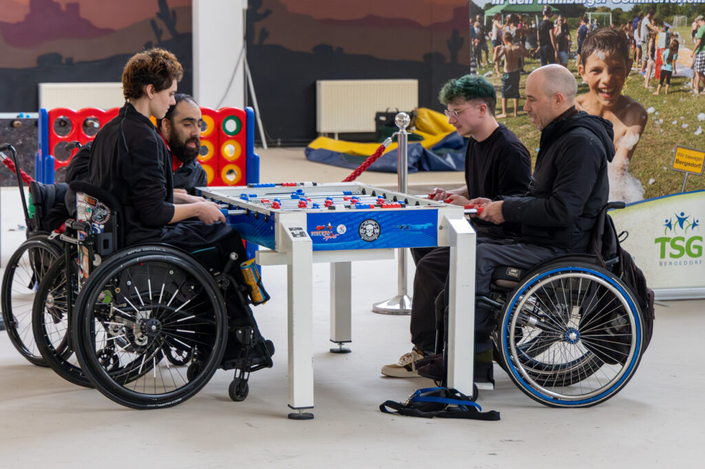 Neben vielen neuen Gesichtern gab es auch zahlreiche Teilnehmende, die zum wiederholten Mal an einem Wheelchair Skills Day teilnahmen, wie etwa Matti, der in Hamburg zum vierten Mal dabei war. Man kannte sich, man tauschte sich aus – es herrschte eine familiäre Atmosphäre. Nach dem ›freien Training‹ stellten sich die Mutigsten der Kinder im anschließenden Kidsrun dem Vergleich, wobei sie an einigen Hindernissen die Wahl hatten zwischen dem ›leichten‹ Weg oder der Herausforderung des schwierigeren Hindernisses. Ohne Zeitdruck konnten die Kids den Parcours absolvieren und es genießen, unter dem Applaus der vielen Zuschauenden zeigen zu können, was sie an dem Vormittag alles gelernt haben.